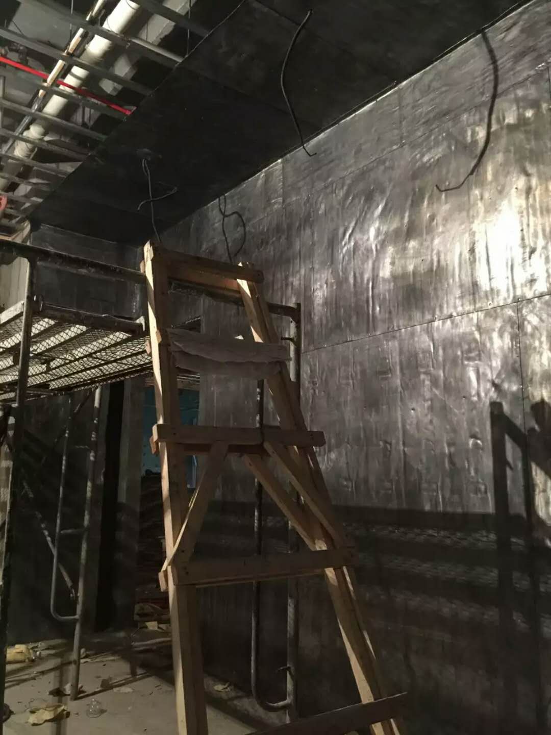 三、鉛板安裝方法為用****膠點粘和天棚粱面粘貼,再用L30*3角鋼對鉛板拼縫處¢8膨脹螺栓@≤500進行固定。遇到固定支架時用剪刀剪開縫隙和洞口繞過固定支架或吊筋進行安裝,然后再用鉛板補粘縫隙和洞口。